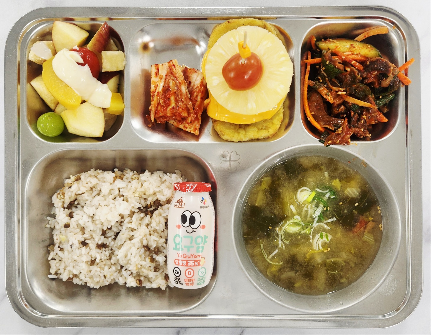 중식 렌틸콩밥 시락국(5.6) 골뱅이야채무침(자율)(5.6.13) 모듬과일샐러드(1.2.5.6.11.12.13)맛밤함박타워(1.2.5.6.10.12.13.16) 배추김치(자율)(9) 미니요구르트(2) * 에너지/단백질/칼슘/철 842.06/20.56/276.05/2.79