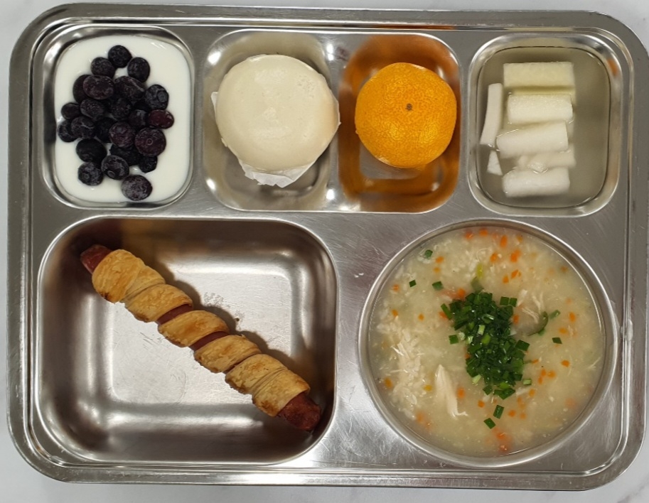 조식 영양닭죽(조)(15) 우리밀단팥찐빵(6) 뱅글소시지(1.2.5.6.10.15.16) *동치미(9) 귤 블루베리수제요거트(2)