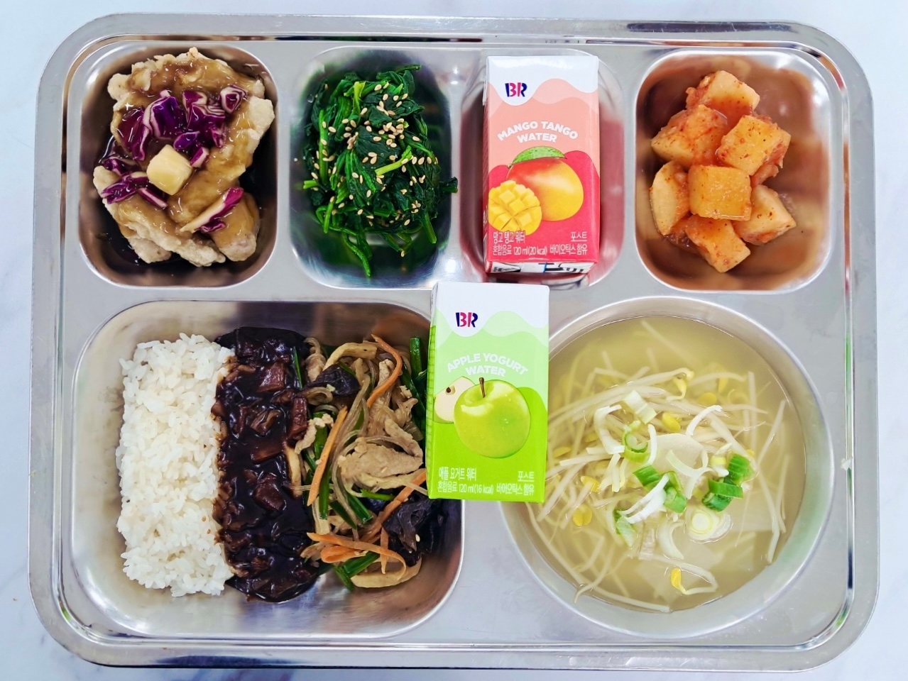 잡채밥/짜장소스(1.2.5.6.10.13.16)매콤콩나물국(5.6.9)시금치나물무침(자율)(5.6.18)탕수육(1.5.6.10.12.13)깍두기(9)미니과즙워터(13)* 에너지/단백질/칼슘/철941.03/30.29/177.58/16.73