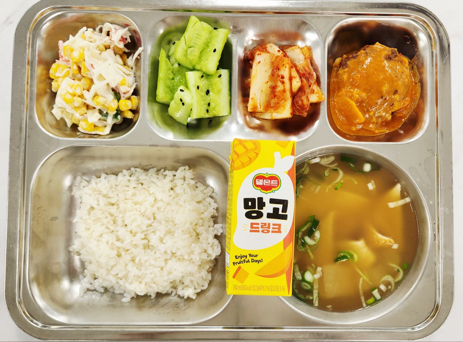[석식] 친환경쌀밥 어묵국(1.5.6) 콘샐러드(1.5.6.8.13) 오이탕탕이(자율)(13) 로제함박스테이크 (1.2.5.6.10.12.15.16) 배추김치(9) 망고주스(13)