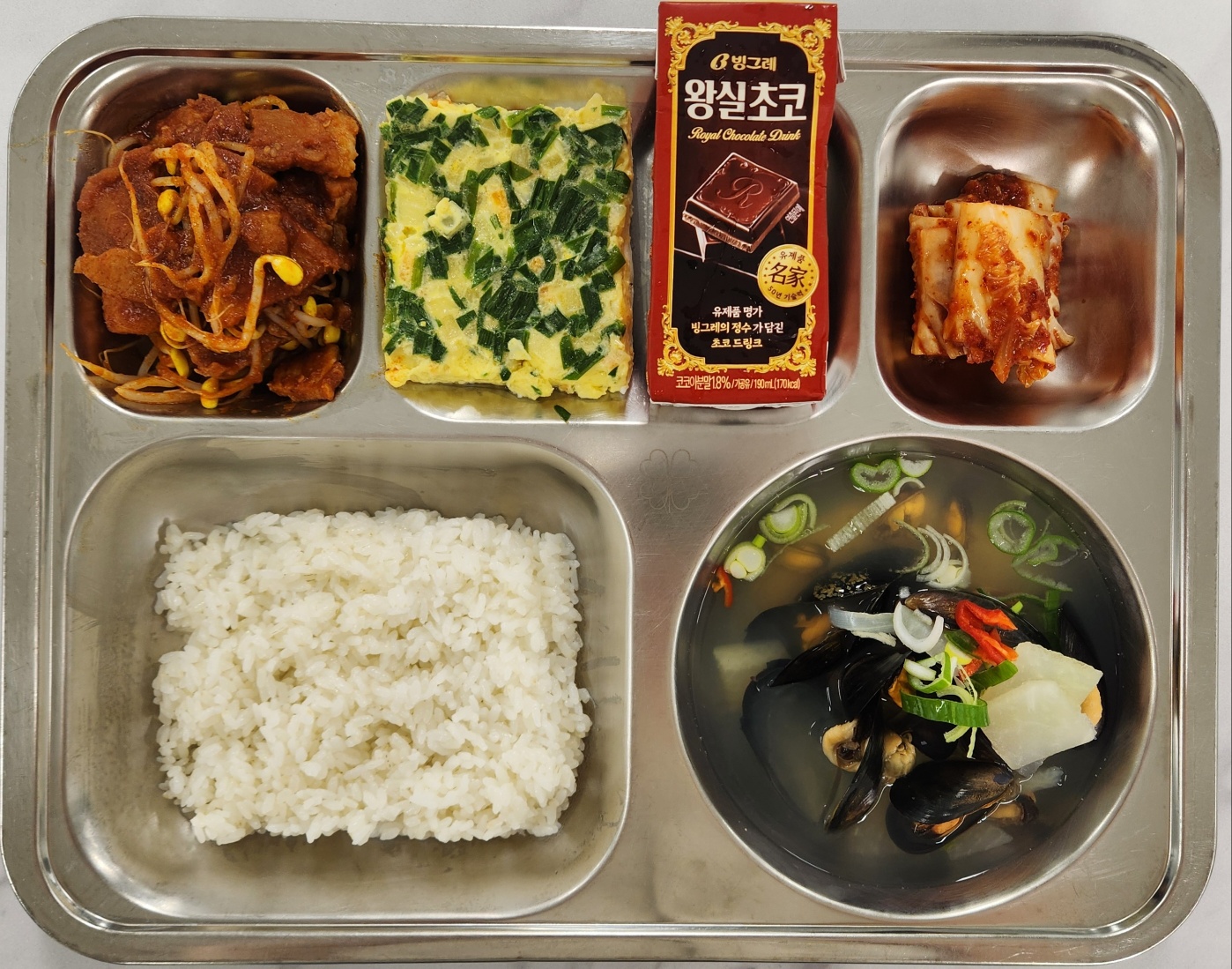 [석식] 친환경쌀밥 피홍합탕(18) 남도식물갈비(5.6.10.13.18) 달걀찜(1.5.6.9) 배추김치(9) 초코우유(2)