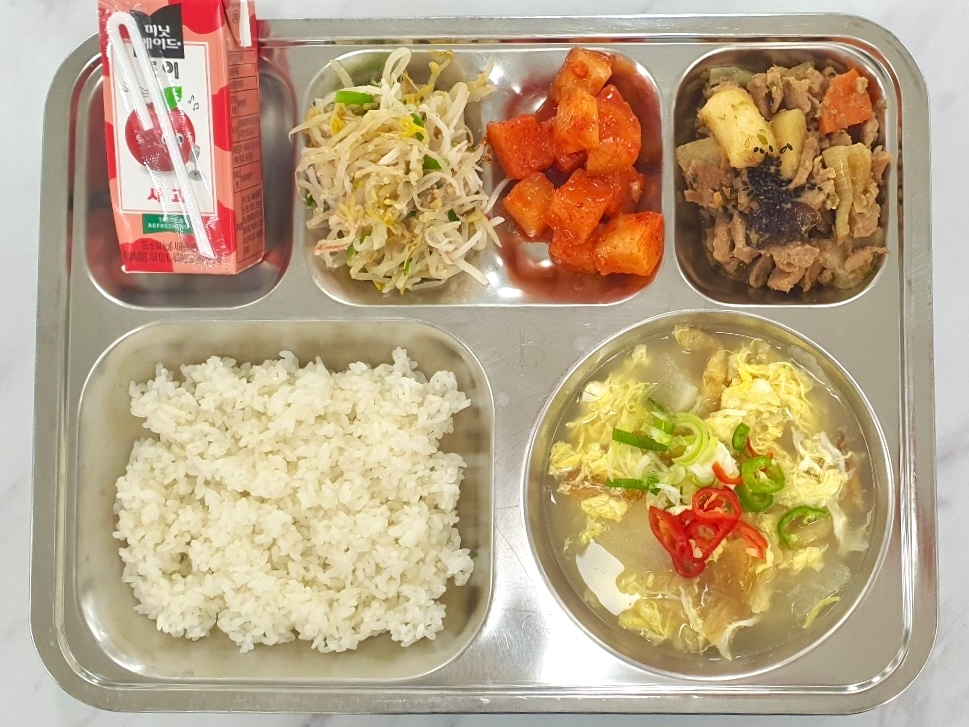 [조식] 친환경쌀밥 황태포국(조)(1.5.6) 돈사태떡찜(조)(5.6.10.13) 크래미숙주나물(조)(1.5.6.8.18) 깍두기(9) 사과주스(13)