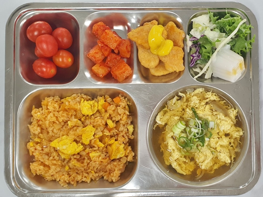 [조식] 김치볶음밥(조)(1.2.5.6.9.10.13.15.16.18) 파송송달걀국(1.5.6) 치킨너겟&머스터드(1.2.5.6.15) 푸딩샐러드(1.2.5.6) 깍두기(9) 스테비아방울토마토(12)