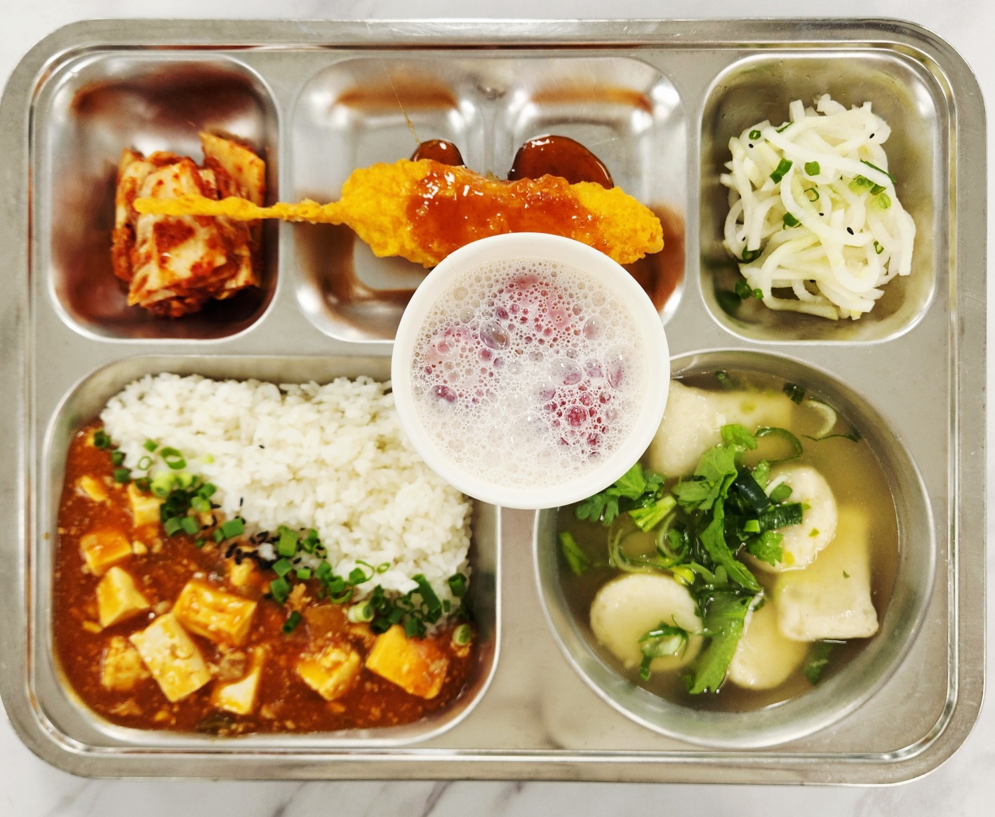 [석식] 마파두부덮밥(5.6.10.12.13.18) 어묵탕(1.5.6) 후라이드닭꼬치(5.6.12.15) 새콤무생채(13) 배추김치(9) 수제딸기라떼(2)