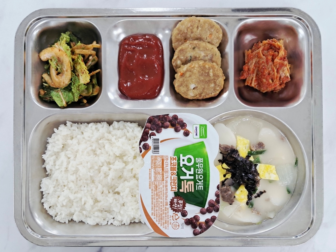 [조식] 친환경쌀밥 사골떡국(1.16) 동그랑땡구이(1.2.5.6.10.12.15.16) 얼갈이양파겉절이(5.6.13) 깍두기(9) 꺾어먹는요거트(2)