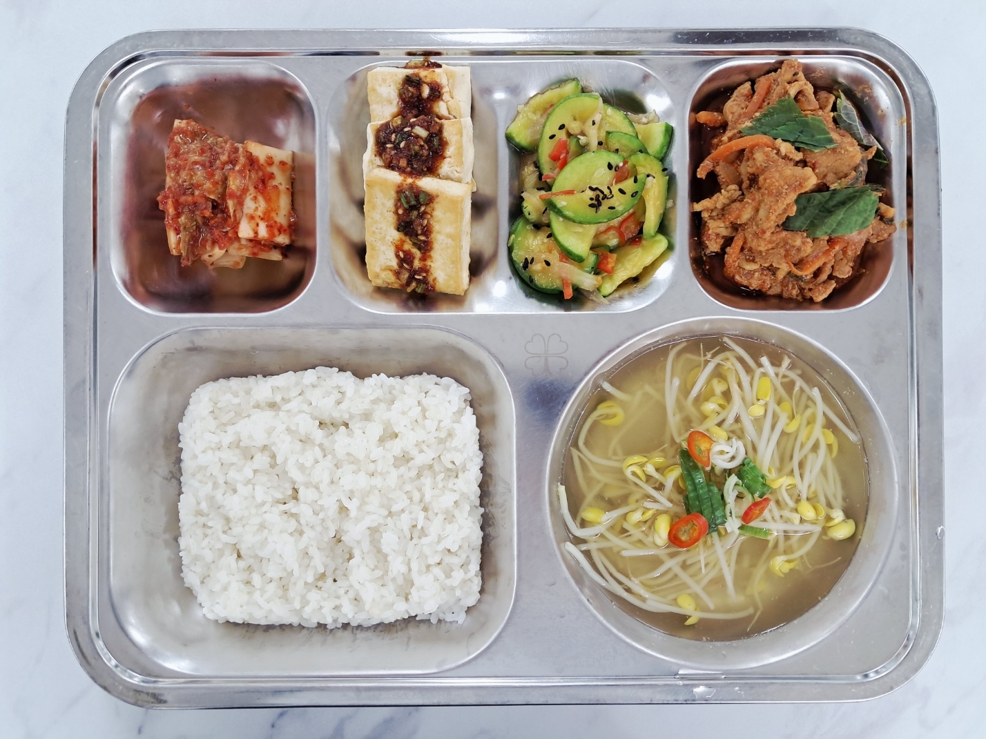 [조식] 친환경쌀밥 맑은콩나물국(5.6.9) 돈육고추장불고기(5.6.10.13) 들기름두부구이(5.6) 애호박볶음(9) 배추김치(9