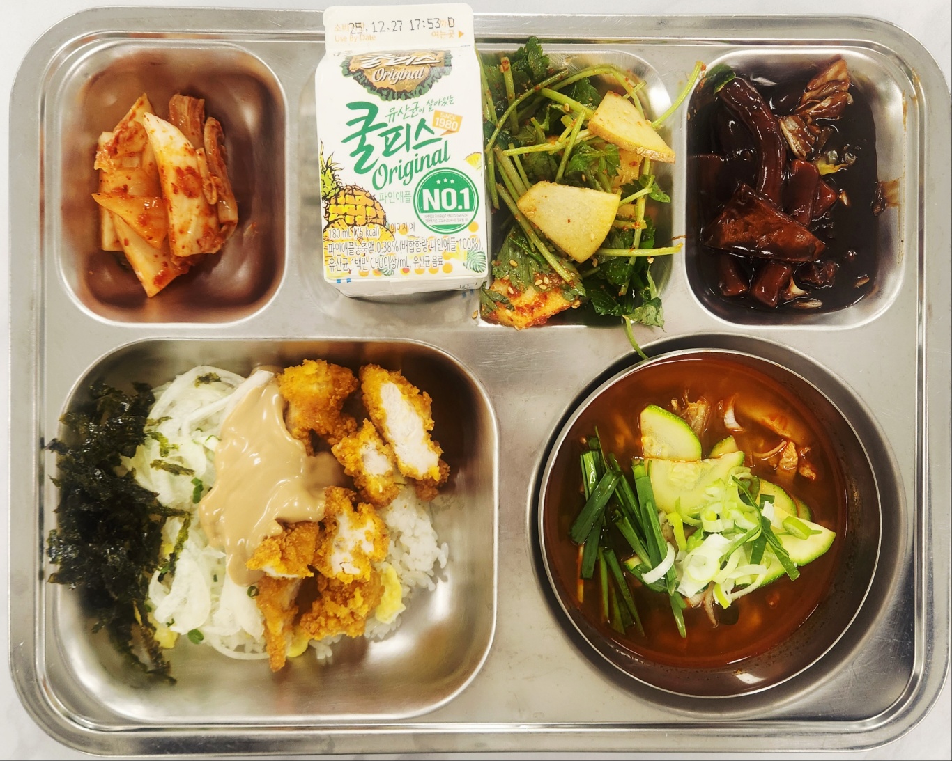 [석식] 치킨마요덮밥(1.5.6.13.15.18) 짬뽕국(면X)(5.6.9.10.17.18) 자장떡볶이(1.2.5.6.13.16) 참나물사과무침(자율)(13) 배추김치(9) 파인애플주스(2)