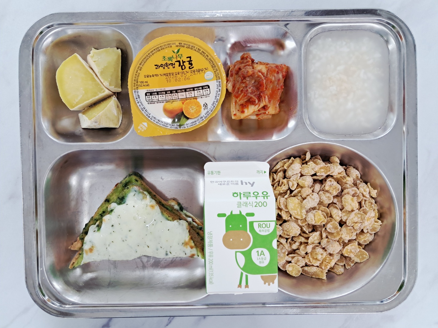 [조식] 크로크무슈(1.2.5.6.10.13.15.16) 숭늉&김치(9) 콘시리얼(5.6) 우유(2) 군고구마 감귤주스(13)